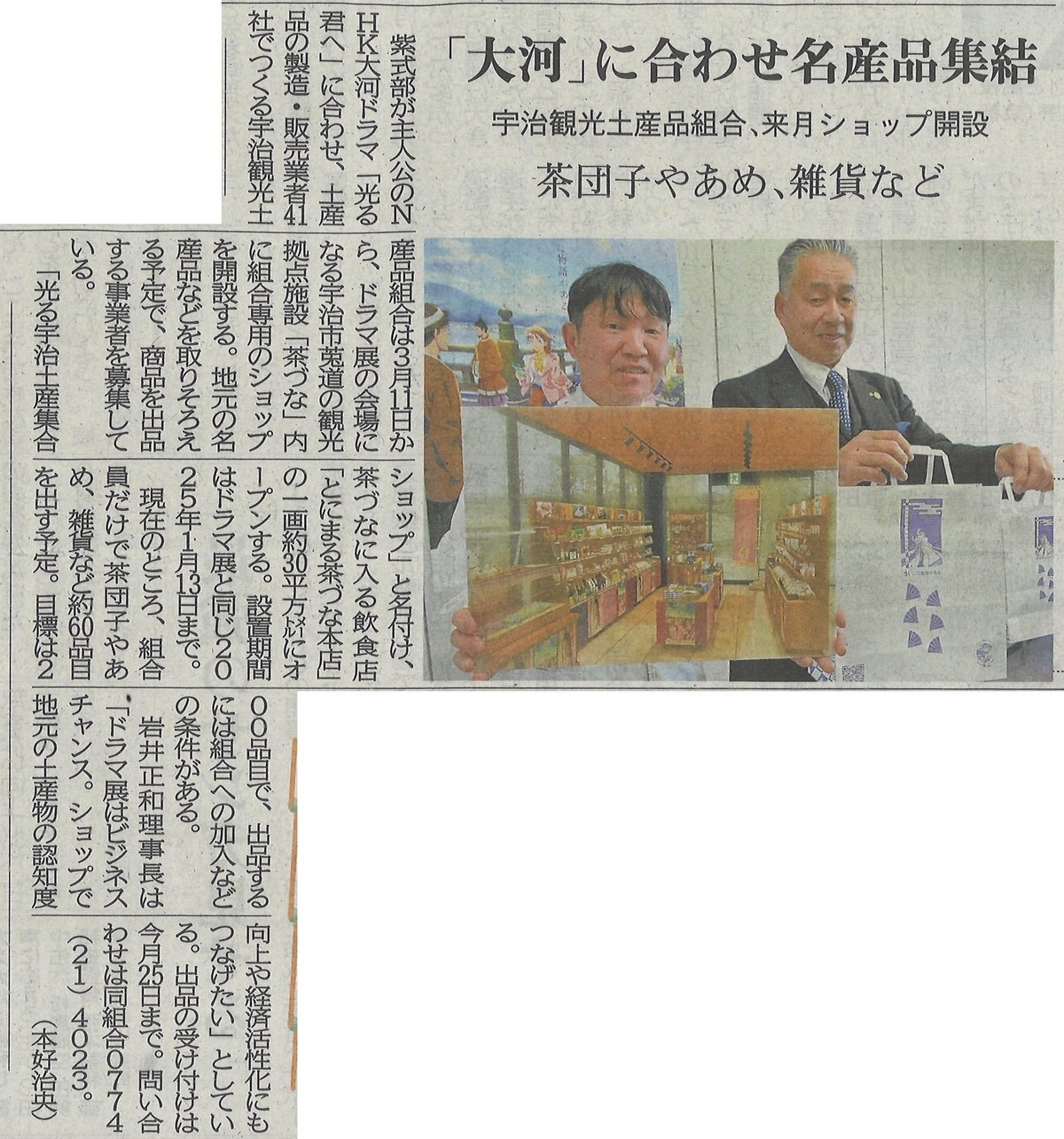 各新聞社にて、大河ドラマ「光る君へ」の放映に合わせた宇治観光土産品組合による「光る宇治土産集合ショップ」について掲載されました。